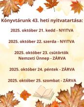 A mellékletben olvashatják könyvtárunk jövő heti nyitvatartását.