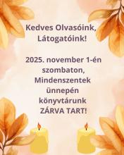 Mindenszentek ünnepén, munkaszüneti napon, e héten szombaton, november 1-én könyvtárunk ZÁRVA tart! Szíves megértésüket köszönjük!