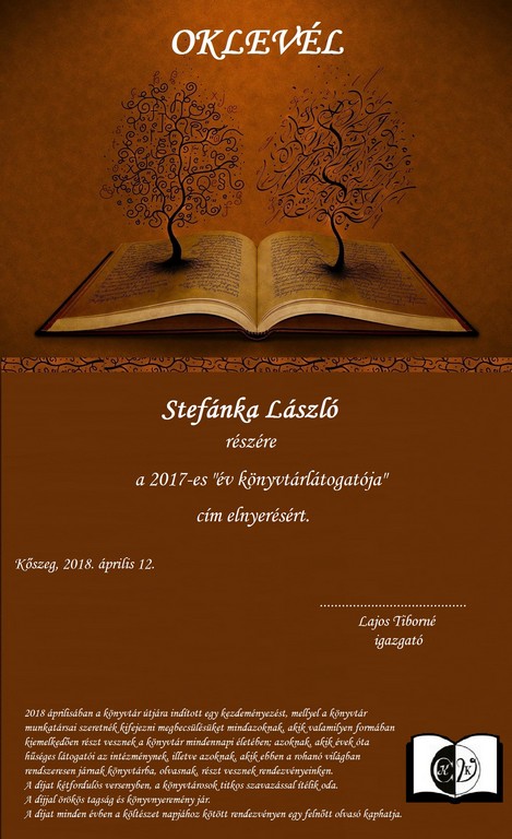 2018 áprilisában a könyvtár útjára indított egy kezdeményezést, mellyel a könyvtár munkatársai szeretnék kifejezni megbecsülésüket mindazoknak, akik valamilyen formában kiemelkedően részt vesznek a könyvtár mindennapi életében; azoknak, akik évek óta hűséges látogatói az intézménynek, illetve azoknak, akik ebben a rohanó világban rendszeresen járnak könyvtárba, olvasnak, részt vesznek rendezvényeinken.