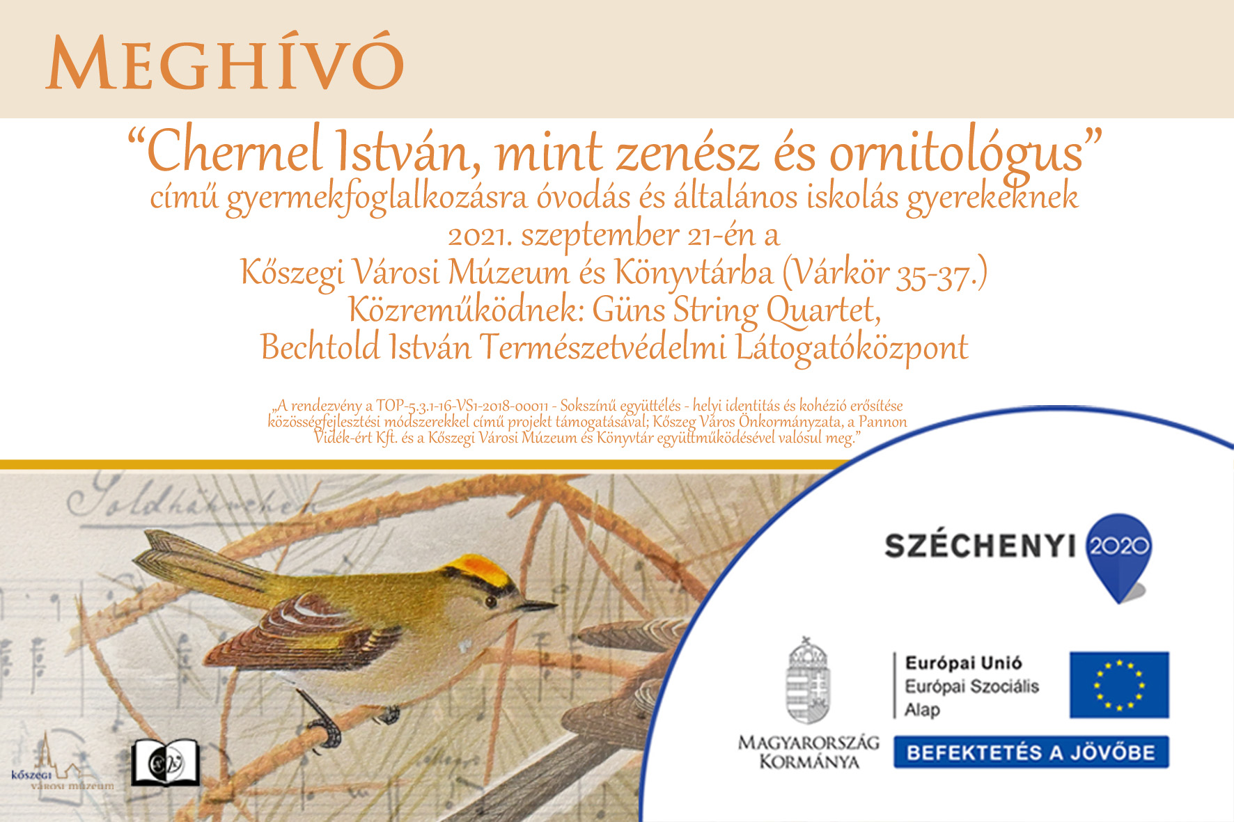Szeretettel várjuk óvodás csoportok és alsó tagozatos osztályok jelentkezését 2021. szeptember 21-én a Kőszegi Városi Múzeum és Könyvtárban (Kőszeg, Várkör 35-37.) tartandó, Chernel Istvánról, s a madarakról szóló, zenei produkcióval egybekötött játékos ismertető foglalkozásra.
