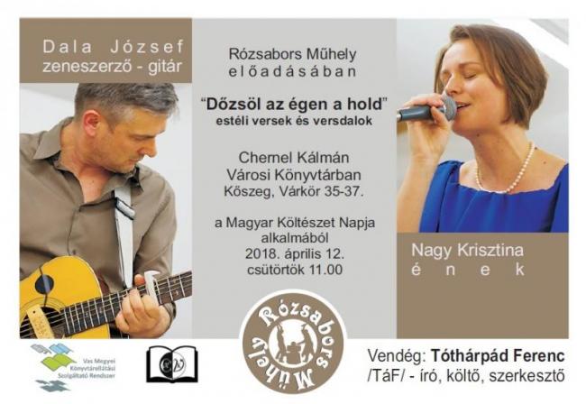 Szeretettel hívjuk és várjuk 2018. április 12-én csütörtökön 11.00 órára, a "Dőzsöl az égen a hold" c. költészet napi műsorunkra. Közreműködik: Tóthárpád Ferenc költő, Nagy Krisztina ének, Dala József gitár.
