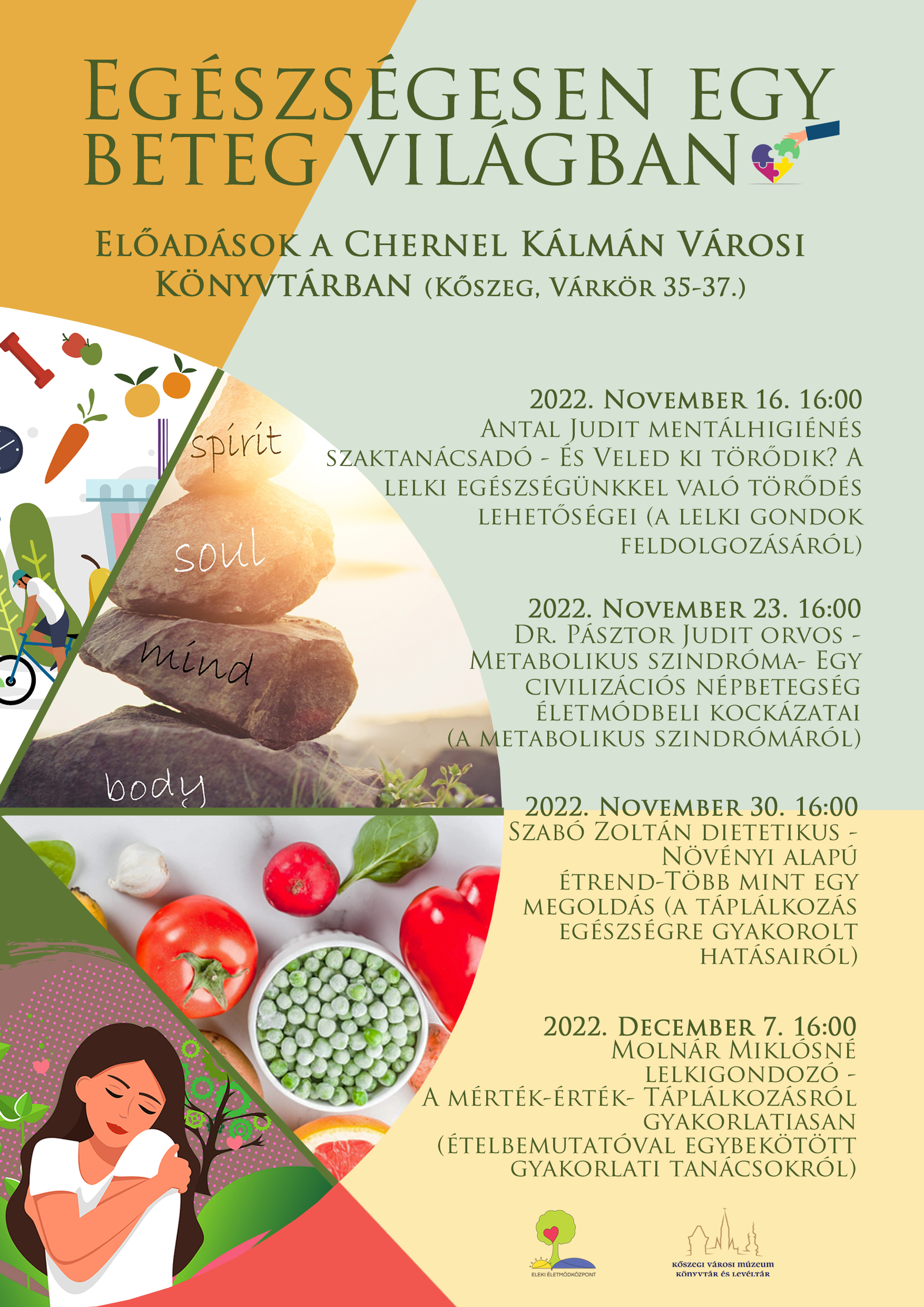 Az Eleki ÉLetmódközpont testi-lelki egészség témájában négyalkalmas előadássorozatot hoz könyvtárunkba novemberi és decemberi időpontokkal. Szeretettel várunk minden érdeklődőt!