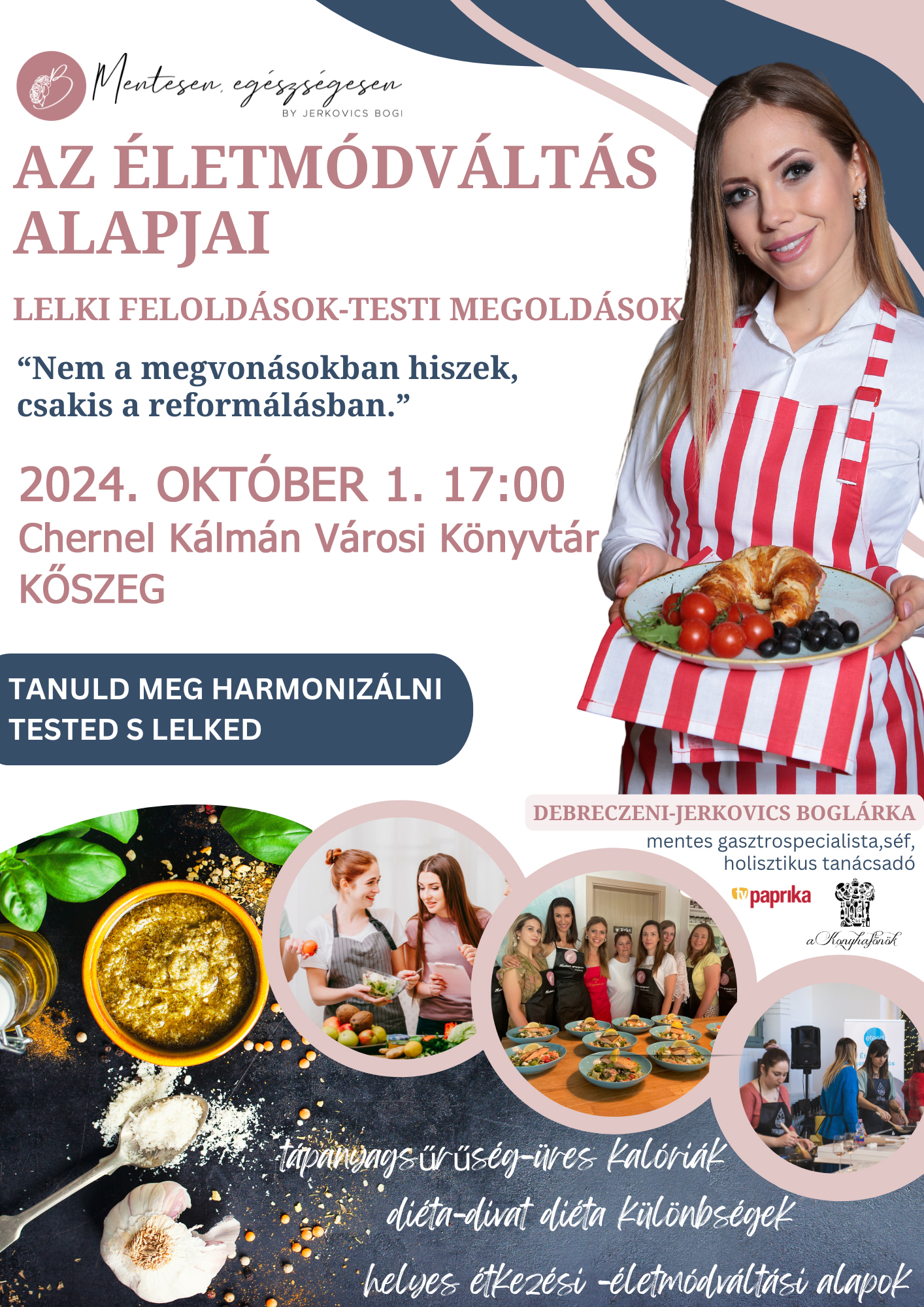 Debreczeni-Jerkovics Boglárka (Jerkovics Bogi), séf, életmód-, és vegán táplálkozási tanácsadó, mentes gasztrospecialista érkezik rendezvénytermünkbe és tart előadást 'Az életmódváltás alapjai - lelki feloldások - testi megoldások' címmel 2024. október 1-én, kedden 17 órakor az Országos Könyvtári Napok 2024 programsorozatának részeként.