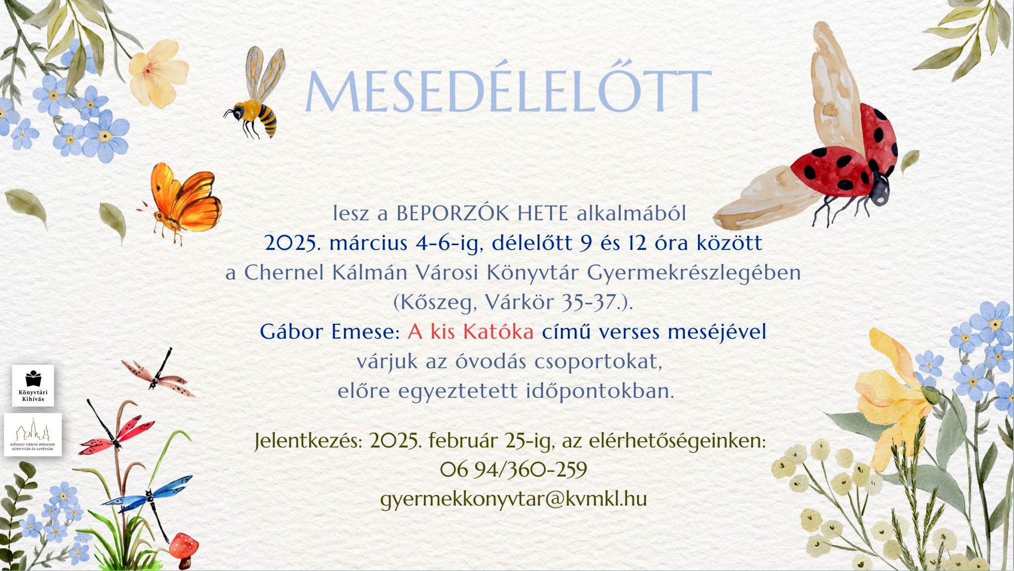 A BEPORZÓK HETE alkalmából 2025. március 4-6-ig 9 és 12 óra között MESEDÉLELŐTT lesz könyvtárunk gyermekrészlegében!