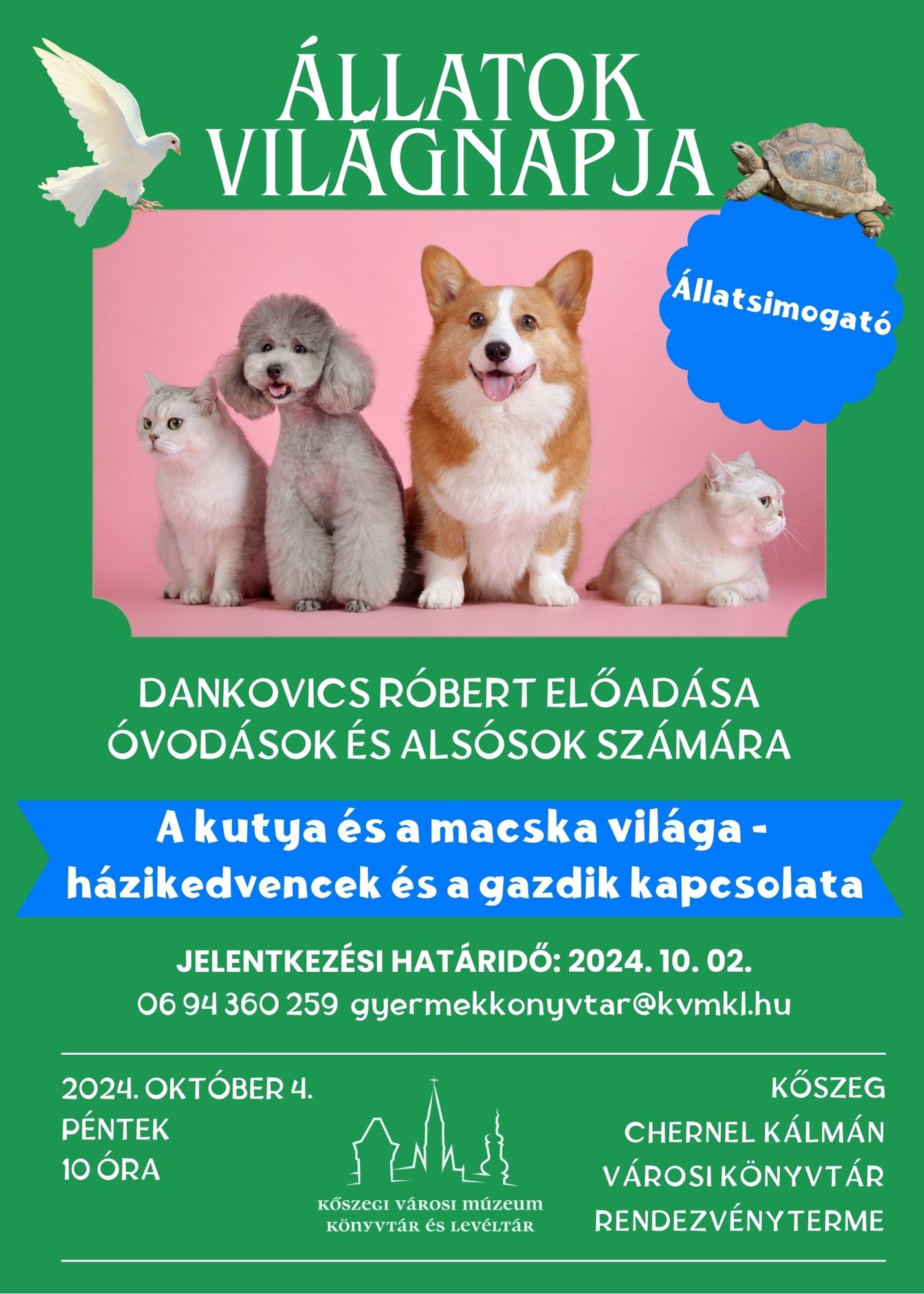 Dankovics Róbert a Savaria Megyei Hatókörű Városi Múzeum munkatársa tart képes előadást rendezvénytermünkben 2024. október 4-én 10 órától az Állatok Világnapja alkalmából 'A kutya és a macska világa - házikedvencek és a gazdik kapcsolata' címmel óvodás csoportoknak, alsó tagozatos általános iskolás osztályoknak, mely után lehetőség nyílik állatok közelebbi megtekintésére és simogatására is!