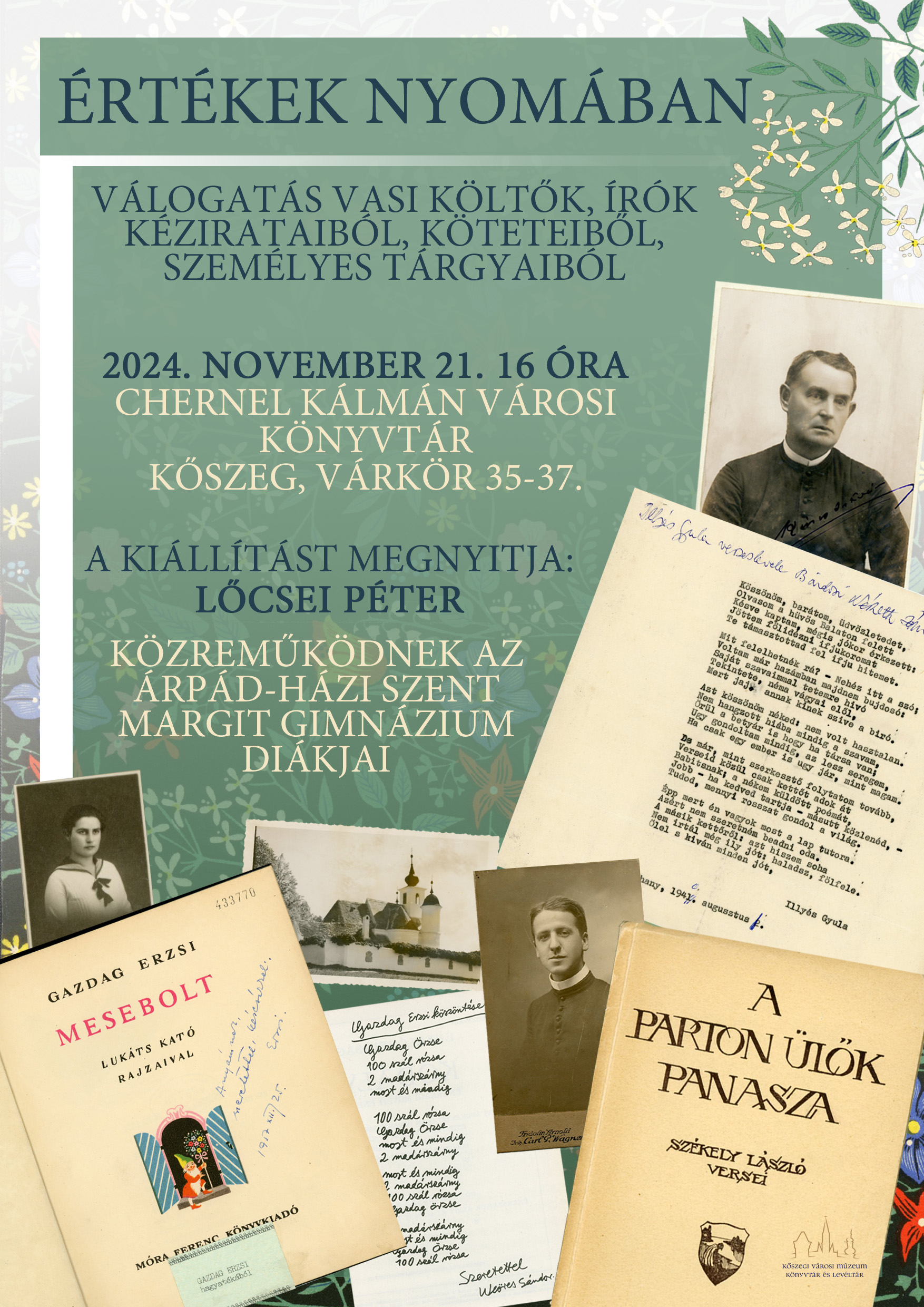 Lőcsei Péter ny. gimnáziumi tanár, Toldy Ferenc-díjas irodalomtörténész újabb kiállítása nyílik 2024. november 21-én, csütörtökön 16 órától első emeleti olvasótermünkben vasi költők, írók kézirataiból, személyes tárgyaiból, köteteiből.