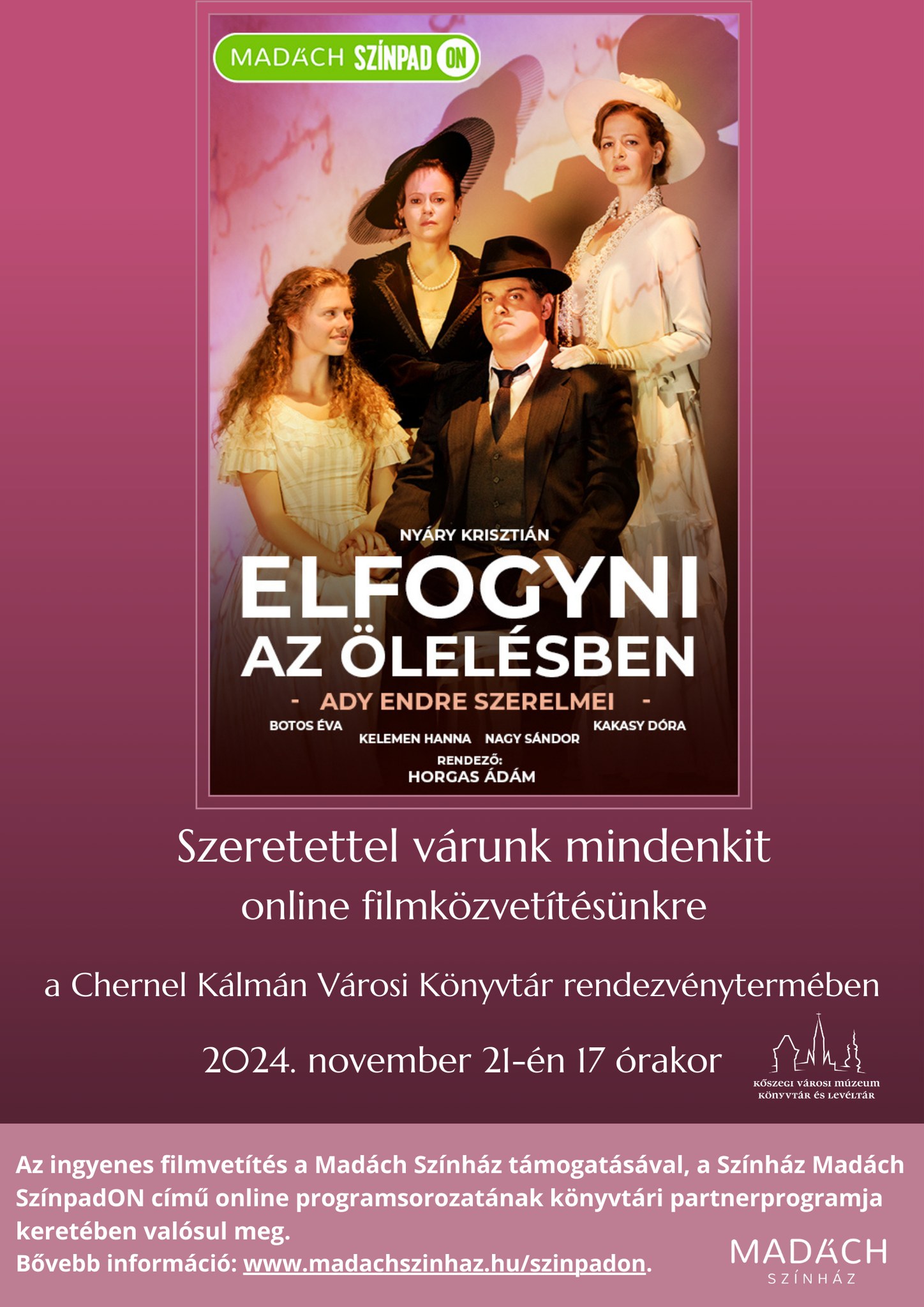 A Madách SzínházON Karinthy film-szín-játék után 2024. november 21-én is lesz filmvetítés (film-szín-játék) rendezvénytermünkben ELFOGYNI AZ ÖLELÉSBEN - ADY ENDRE SZERELMEI címmel 17 órától.