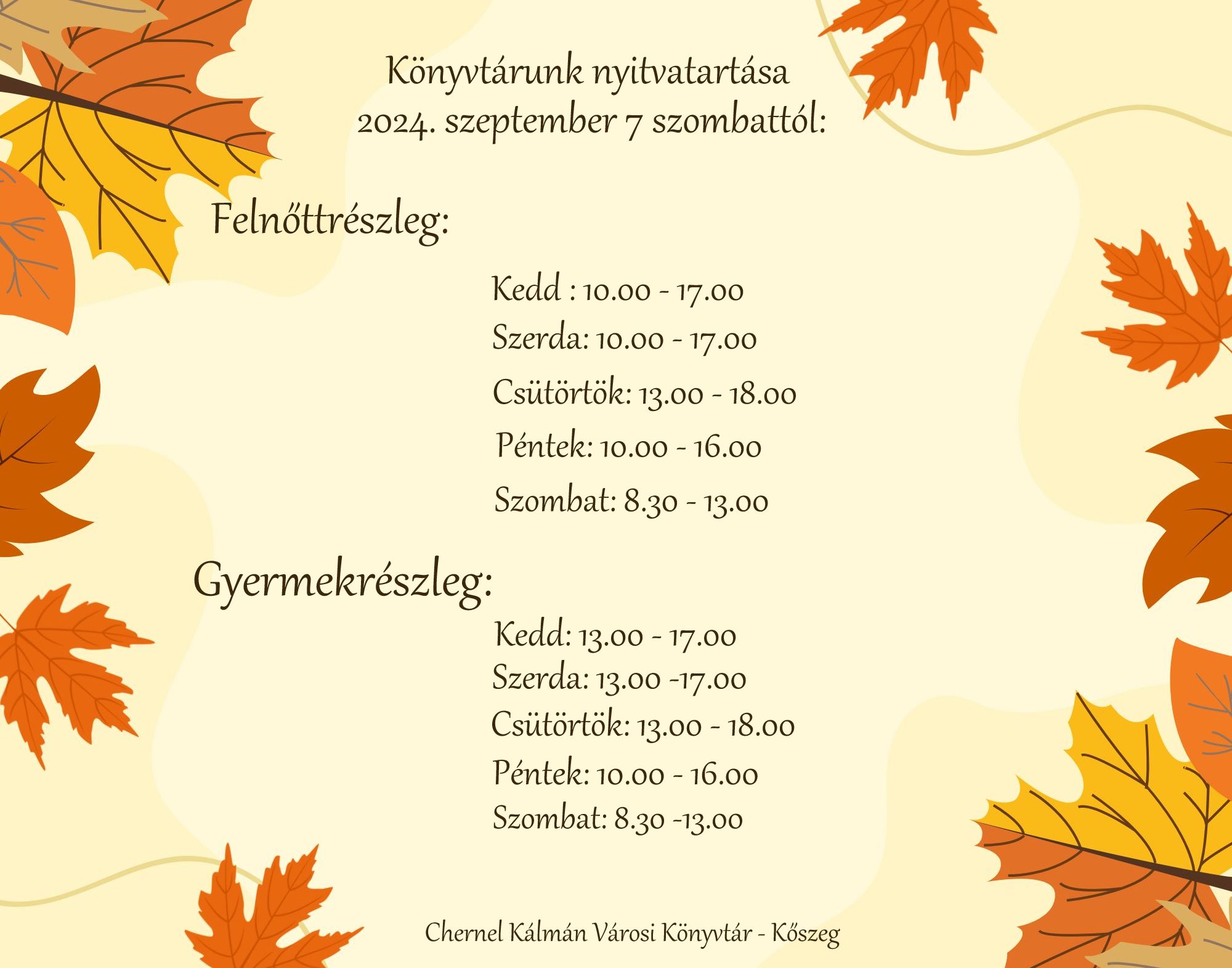 Szeptember 7-től, a 2024/2025-ös tanév időtartama alatt ismét nyitva leszünk szombatonként. Szeretettel várjuk Önöket!
