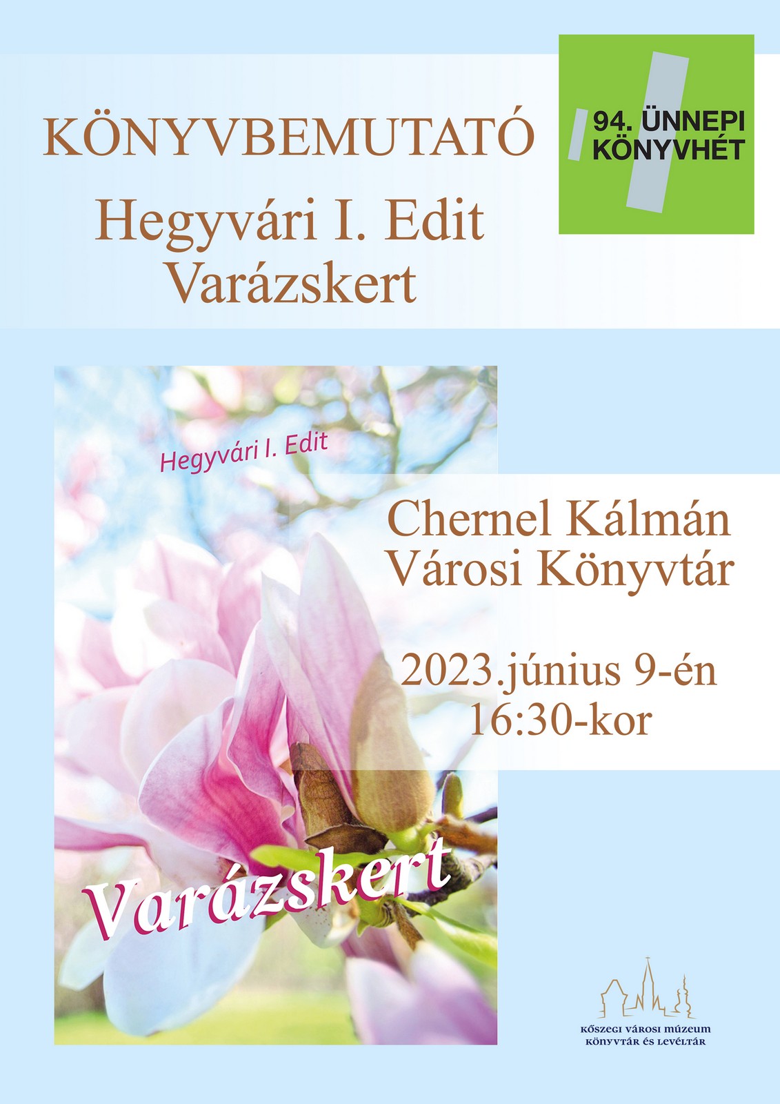 Szeretettel meghívjuk Önöket Hegyvári I. Edit 2023.06.09-én 16:30 órakor kezdődő író-olvasó találkozójára a Chernel Kálmán Városi Könyvtárba.