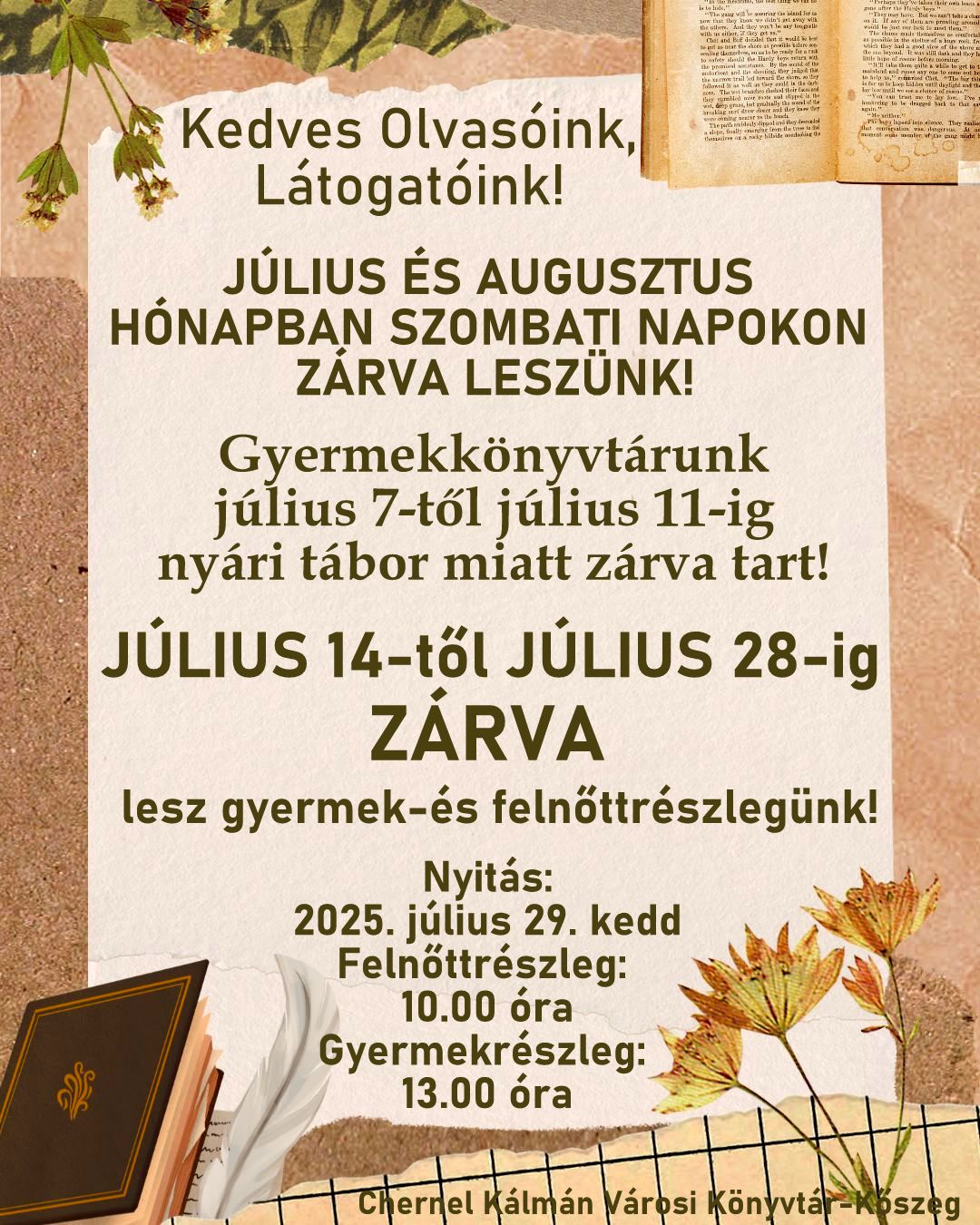 A GYERMEKRÉSZLEGEN 2025. július 4. péntekig, a FELNŐTTRÉSZLEGEN 2025. július 11. péntekig tudnak kölcsönözni!