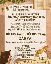Az elkövetkezendő napokban, hetekben kérjük figyeljenek oda a kölcsönzési határidőkre, lehetőségekre, mert JÚLIUS HÓNAPBAN a gyermekrészleg 3 hétig, a felnőttrészleg 2 hétig ZÁRVA tart!