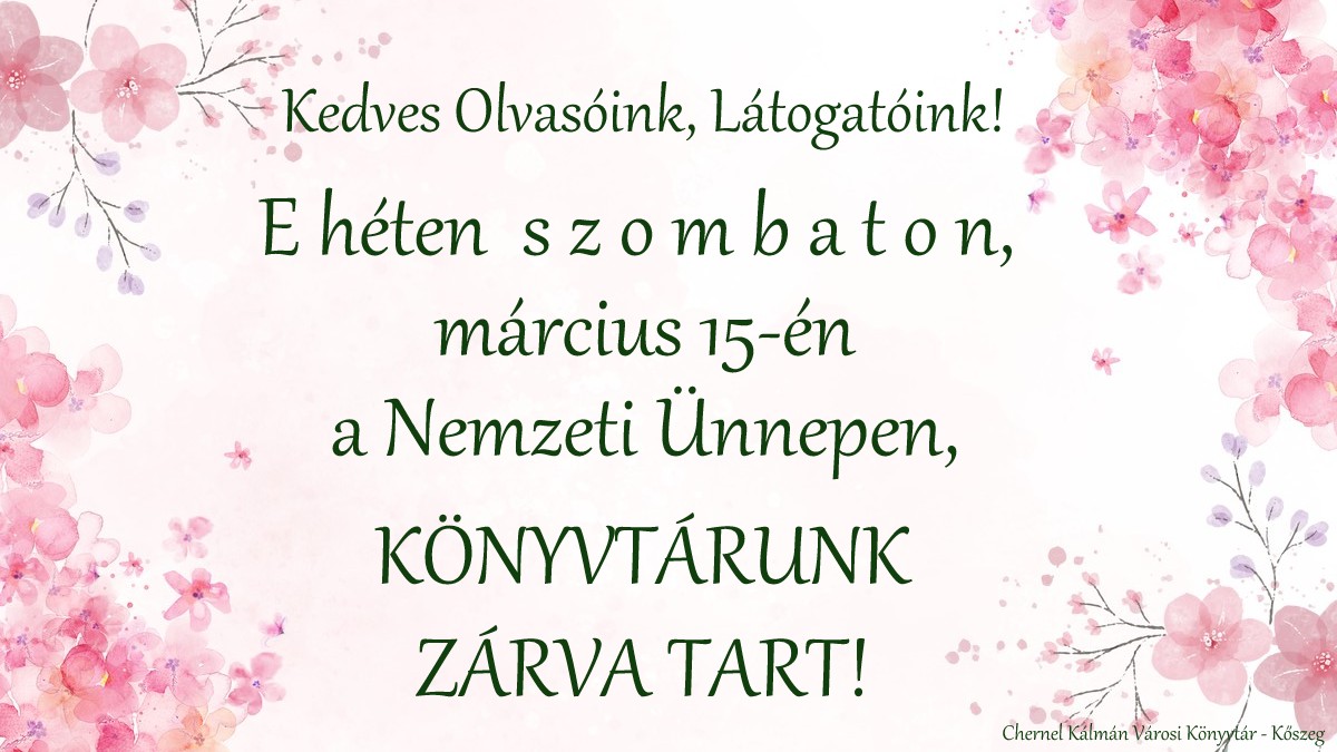Könyvtárunk e hét szombaton, 2025. március 15-én a Nemzeti Ünnepen zárva tart!