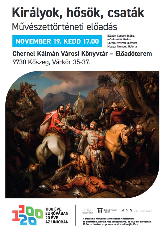 Sok szeretettel várunk minden érdeklődőt 2024. november 19-én 17 órától rendezvénytermünkbe Sepsey Zsófia művészettörténész interaktív előadására a Petőfi Kulturális Ügynökség szervezésében, 'Királyok, hősök, csaták' - 1100 év Európában címmel.