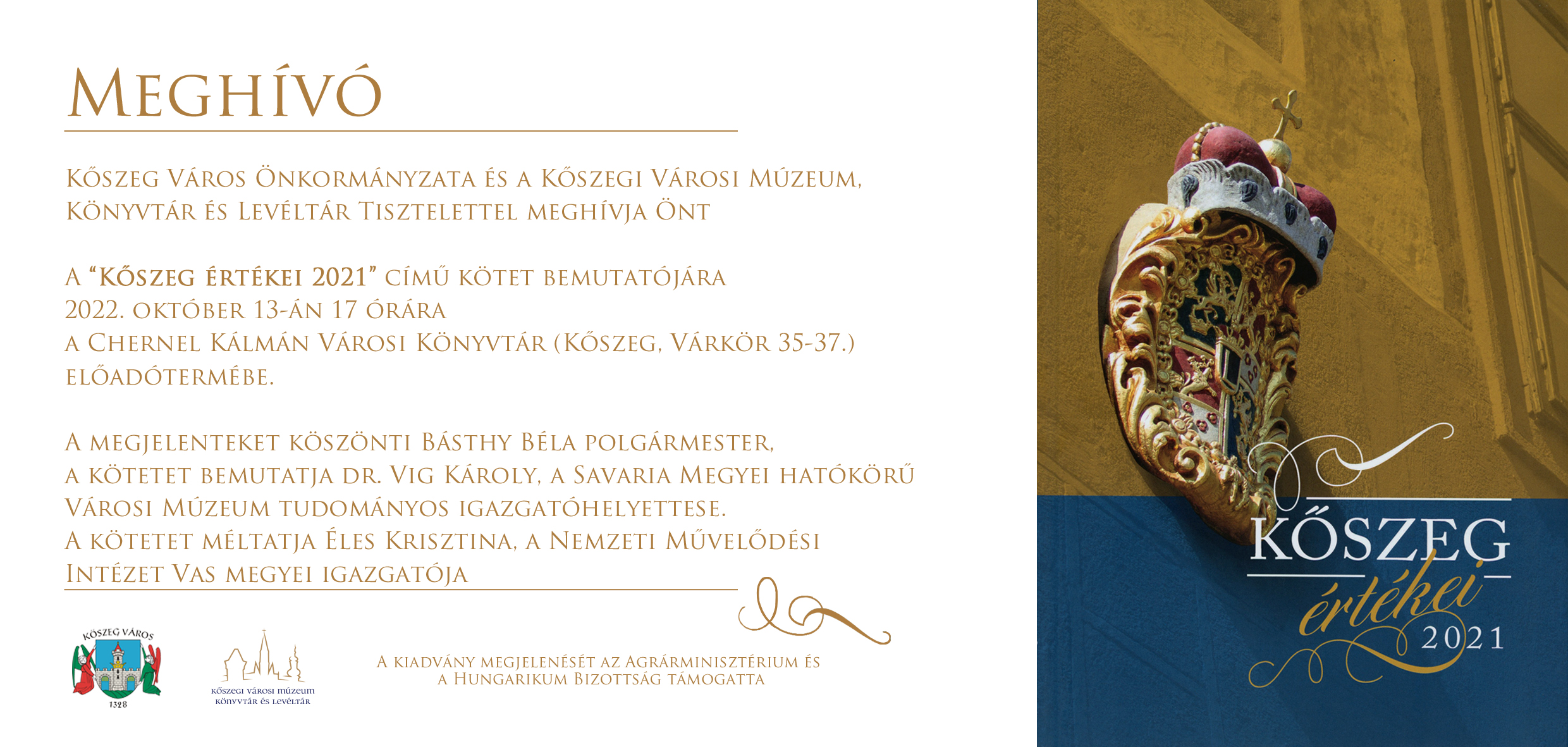 Szeretettel várunk minden kedves érdeklődőt a "Kőszeg értékei 2021" című kötet bemutatójára 2022. október 13-án 17:00 órára a Chernel Kálmán Városi Könyvtárba (Kőszeg, Várkör 35-37.)