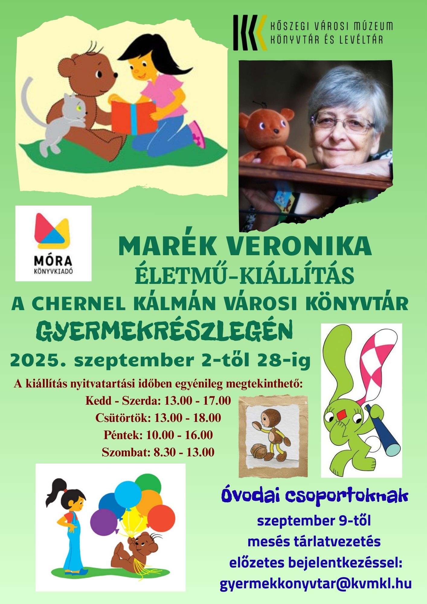 Óvodás csoportoknak Szabó Andrea gyermekkönyvtáros kolléganőnk tart mesés tárlatvezetést szeptember 9-től délelőtti órákban előzetes e-mail-es jelentkezés, egyeztetés után: gyermekkonyvtar@kvmkl.hu