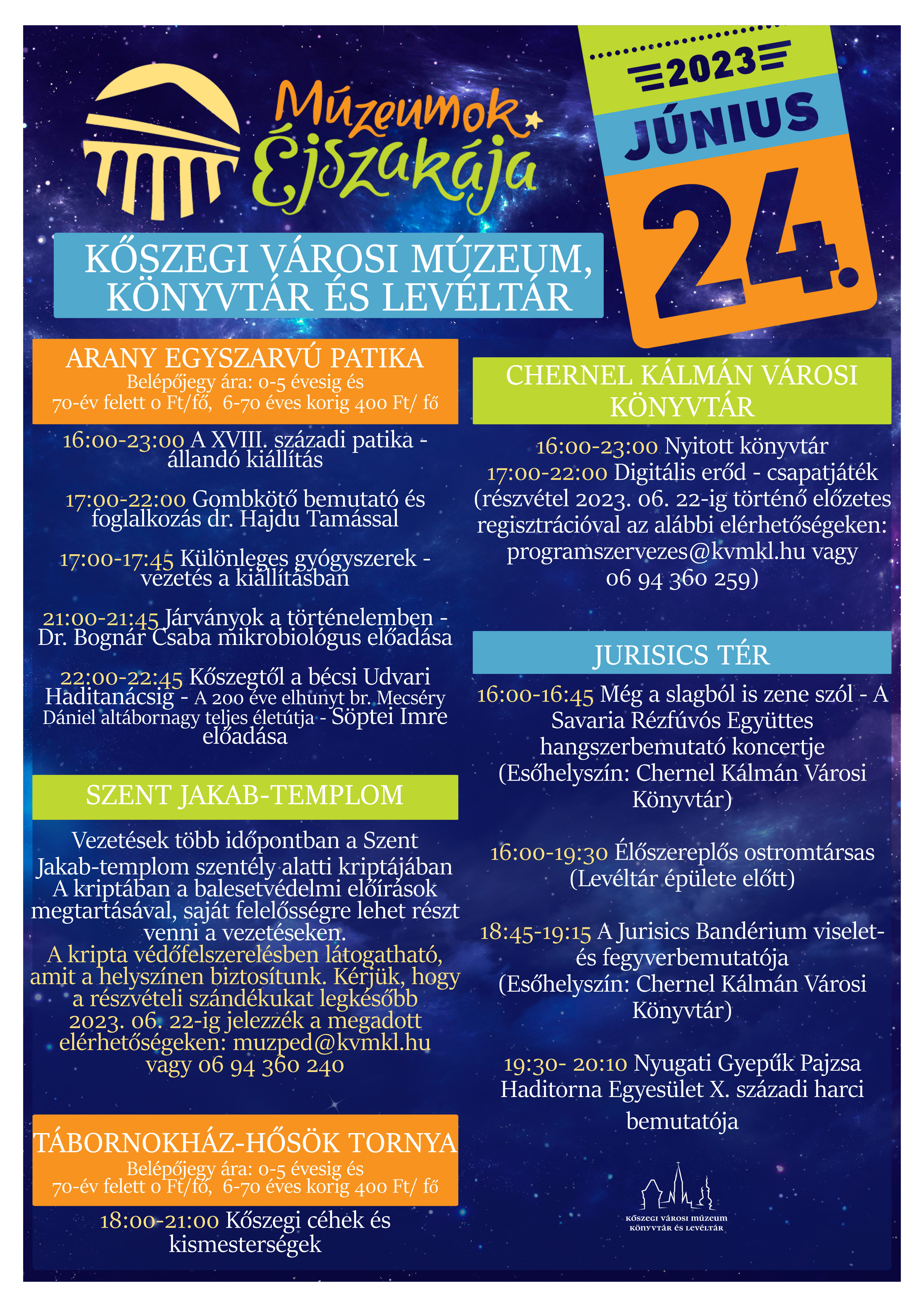 A rendezvény miatt az Arany Egyszarvú Patika 2023. június 24-én 16:00-tól 23:00-ig, a Tábornokház-Hősök tornya 18:00-tól 21:00-ig tart nyitva. A kőszegi Várkiállítás ezen a napon zárva lesz, helyette vasárnap, 2023. június 25-én 10:00-17:00-ig tart nyitva. Június 24-én (vasárnap) a Tábornokház-Hősök tornya zárva lesz.