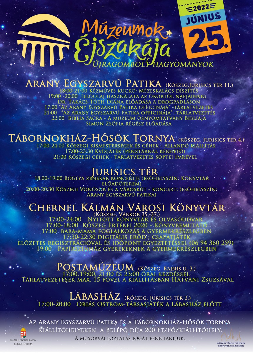 A Kőszegi Városi Múzeum, Könyvtár és Levéltár öt helyszínnel, s a kőszegi Postamúzeum is ismét csatlakozik a Múzeumok Éjszakája országos rendezvényéhez.