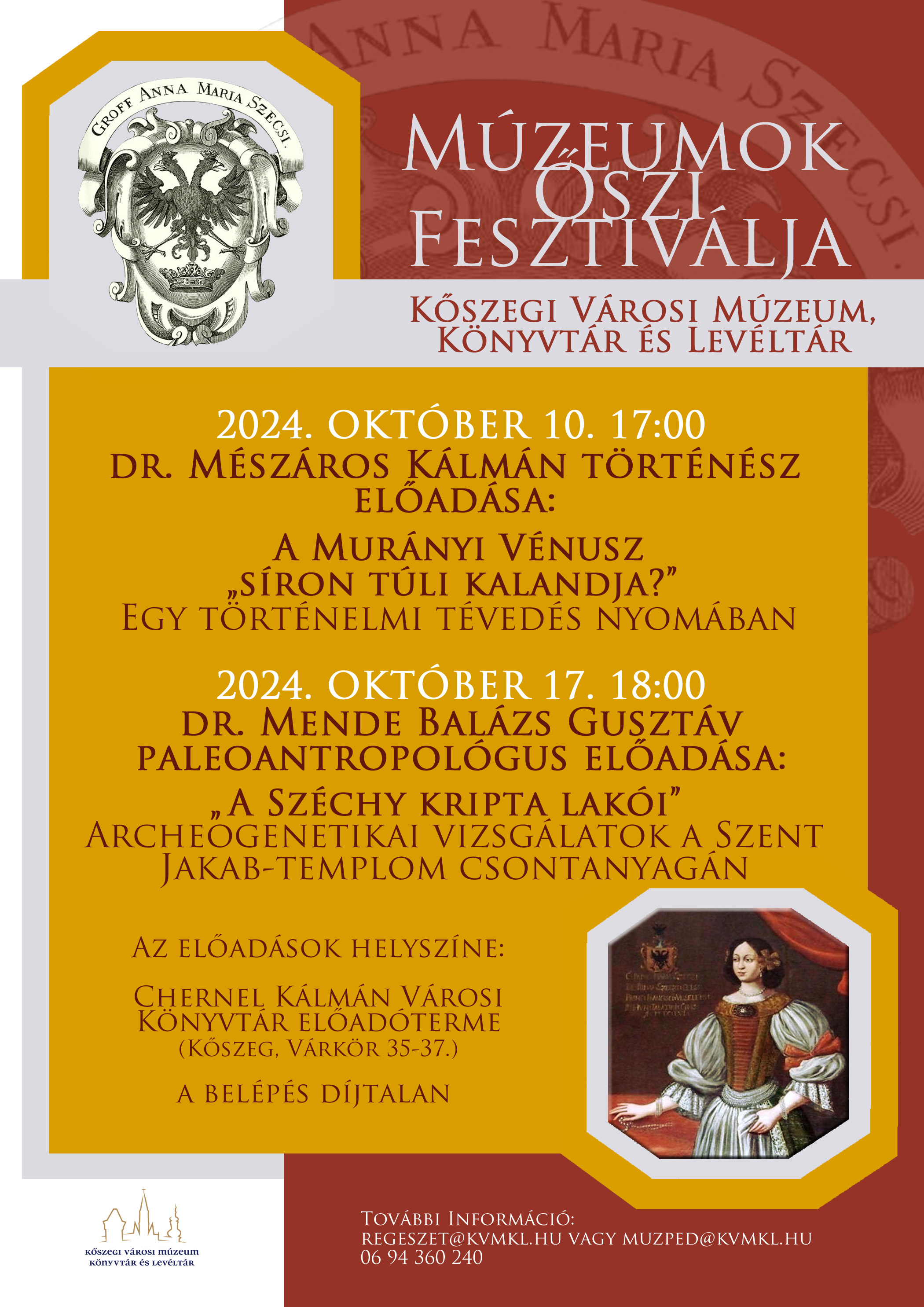 2024. október 10-én 17 órakor dr. Mészáros Kálmán történész, a Hadtörténeti Intézet és Múzeum munkatársa, A Murányi Vénusz "síron túli kalandja"? Egy történelmi tévedés nyomában című,