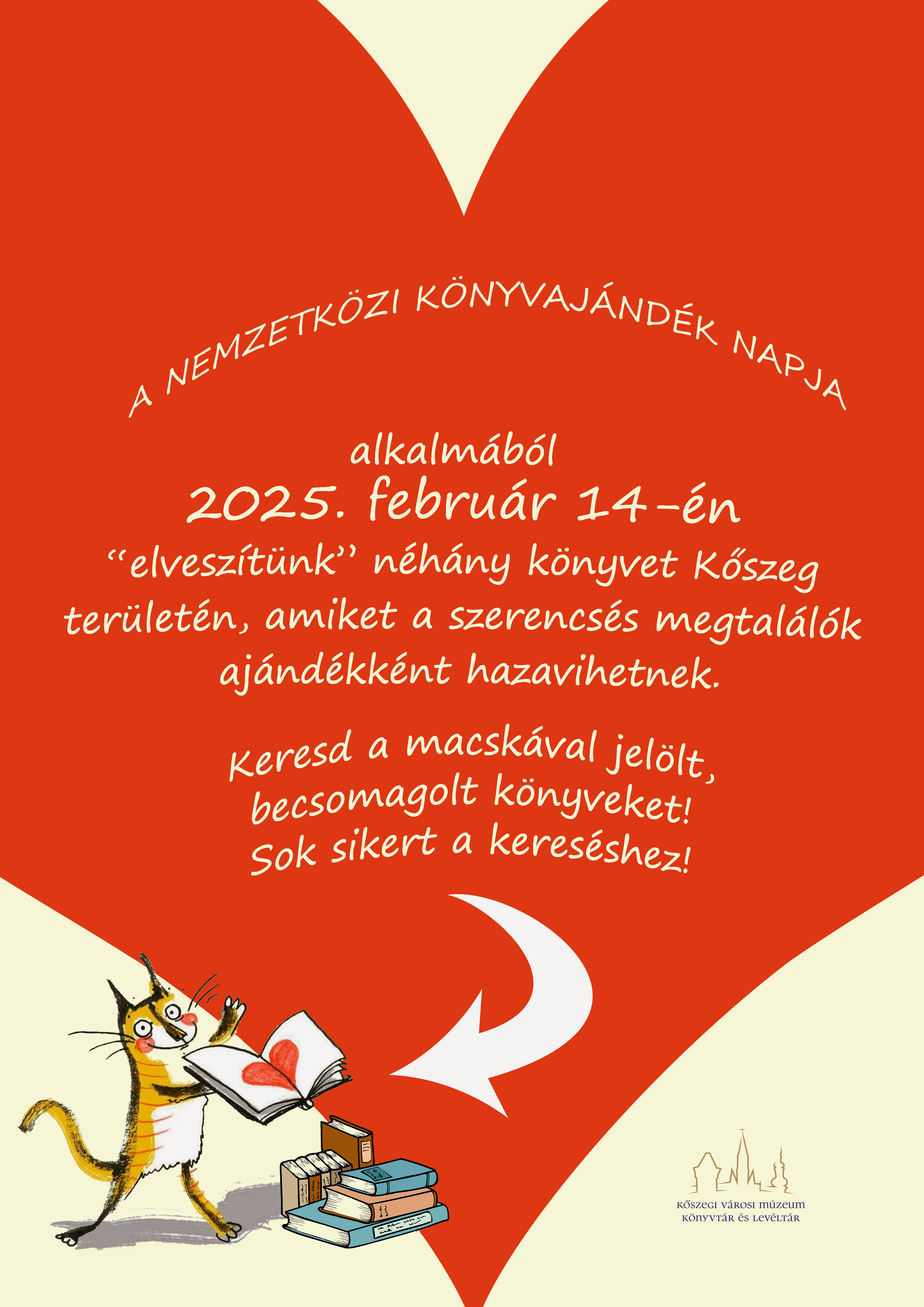 E jeles, olvasásnépszerűsítő ünnephez könyvtárunk ismét csatlakozik, 14-én városszerte Kőszegen 'Elveszített, becsomagolt, macskával jelölt ajándékkönyvek' találhatnak új gazdára.