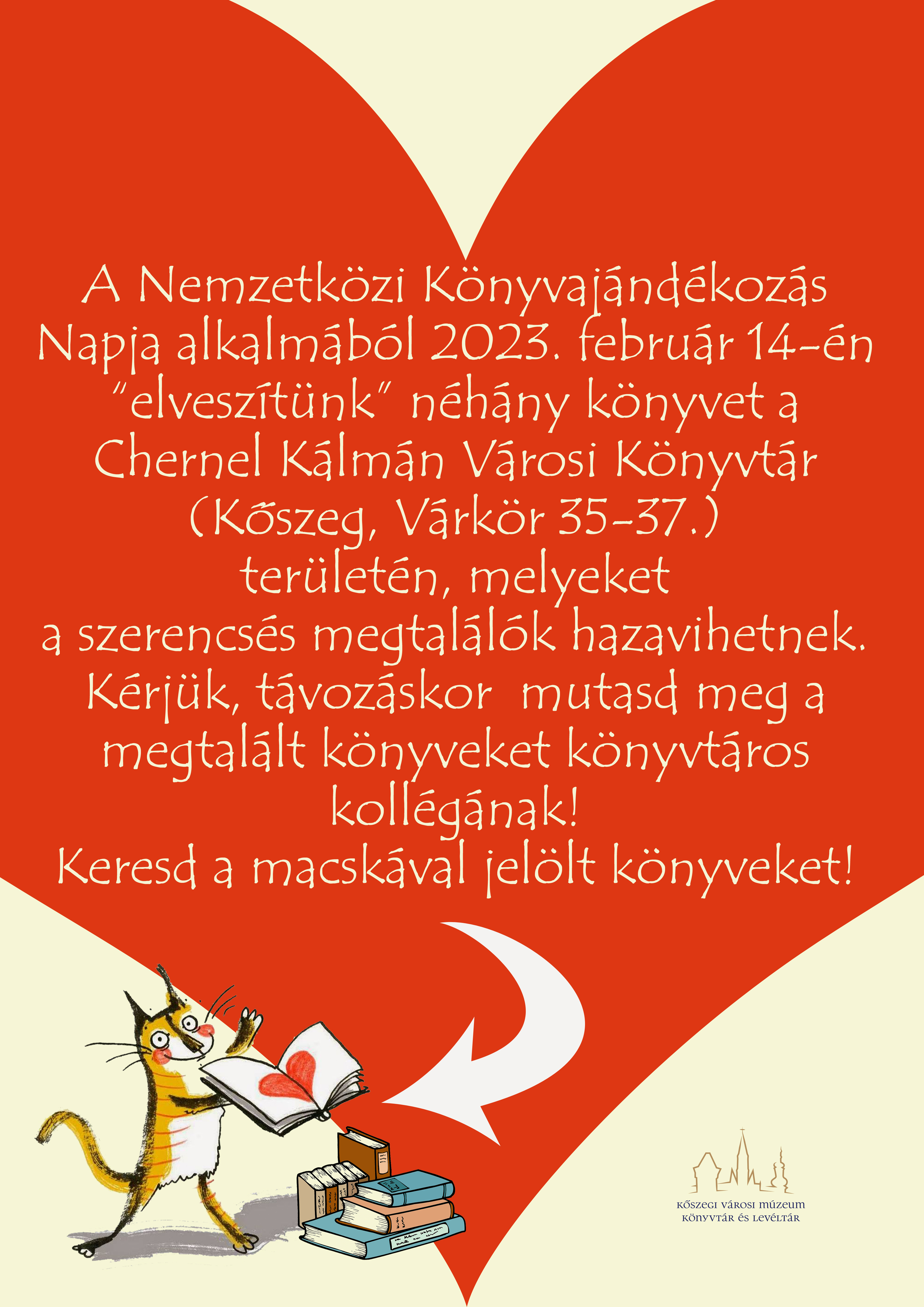 A könyvtárba betérni mindig érdemes, de február 14-én még inkább, mint máskor! Ezen a napon ugyanis a könyvtár területén olvasóink és a könyvtár által felajánlott, macskás emblémával ellátott könyveket "veszítünk el". A szerencsés megtalálók ezek közül hazavihetnek egyet.