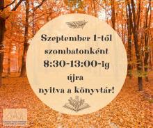 Szeptember 1-től szombatonként 8:30-13:00-ig újra nyitva a könyvtár.