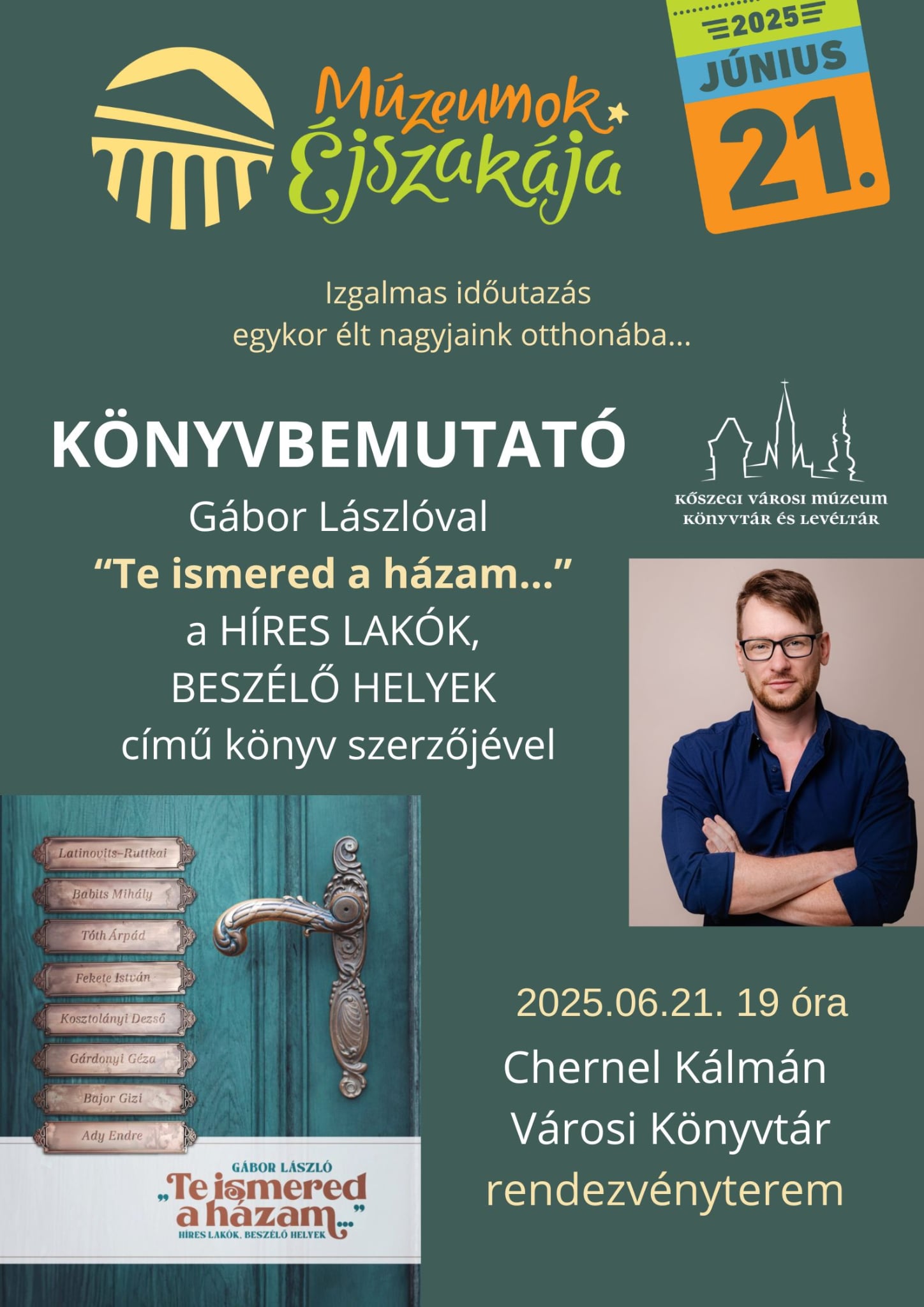 Sok szeretettel várjuk az érdeklődőket a Múzeumok Éjszakáján rendezvénytermünkbe - 2025. június 21-én szombaton - 19 órára időutazásra Gábor László „Te ismered a házam…” – Híres lakók, beszélő helyek című gazdagon illusztrált gyönyörű könyvével, mely egy nem mindennapi útikönyv: térben és időben navigál, sztorikkal, érdekességekkel, fotókkal.
