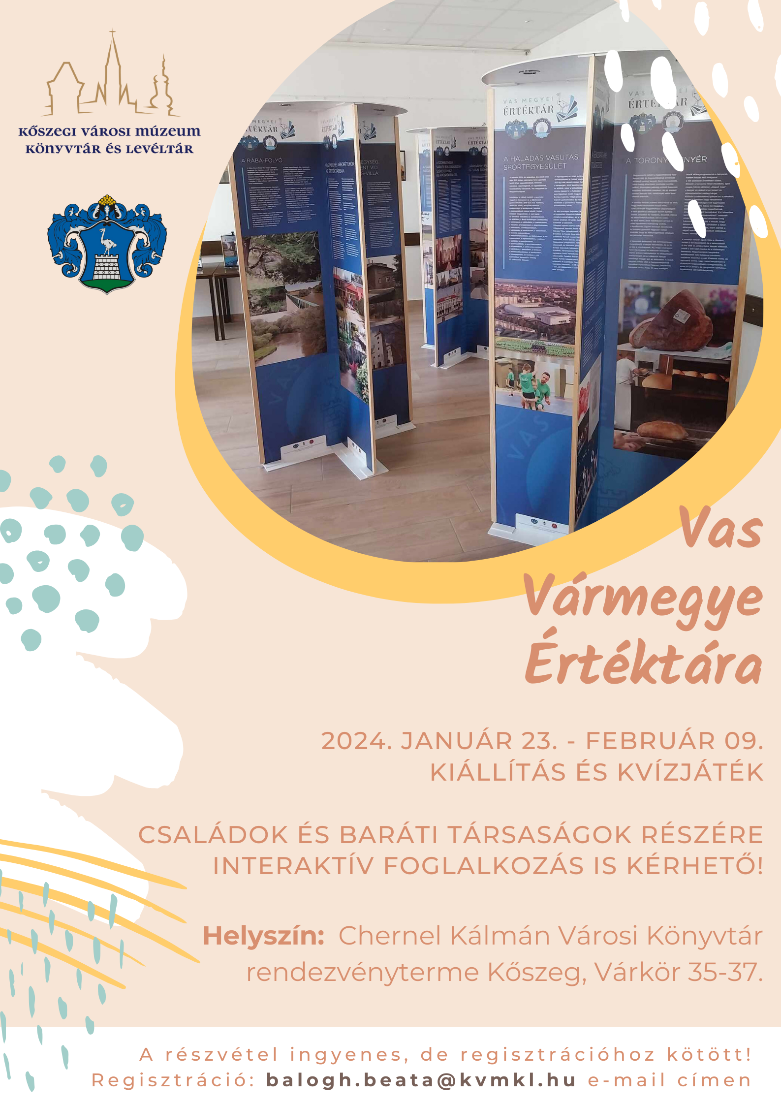 A Kőszegi Városi Múzeum, Könyvtár és Levéltár a Chernel Könyvtár rendezvénytermében 2024. január 23.-február 09. között a Vas vármegyei Értéktár kiállításhoz térítésmentesen interaktív foglalkozást is kínál felsősök és középiskolások, valamint családok, baráti társaságok részére!