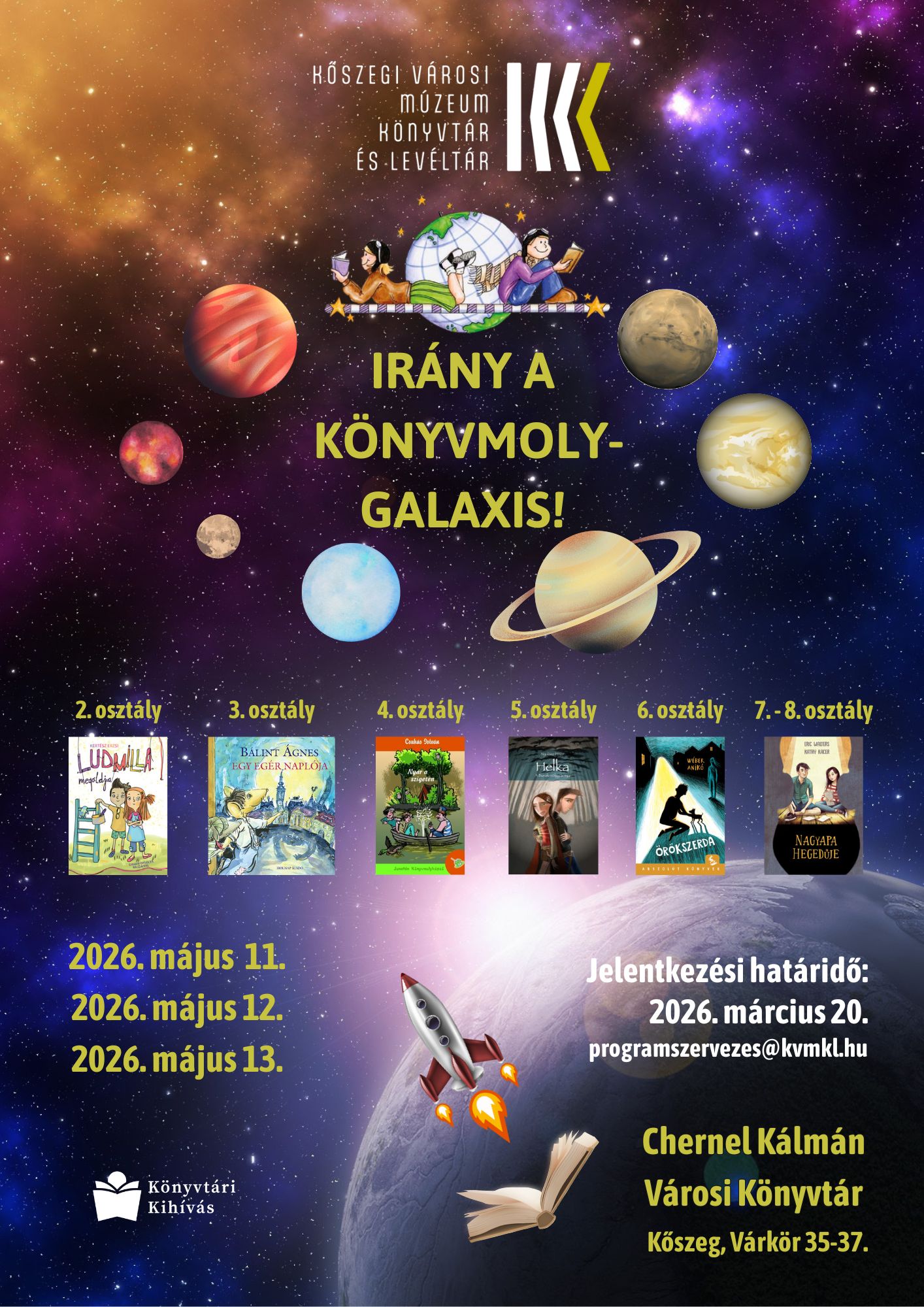 Elküldtük a kőszegi és Kőszeg térségi általános iskolák intézményvezetőinek, pedagógusainak tájékoztató levelünket az 'Irány a Könyvmolygalaxis!' 2026. versenyünk jelentkezési határidejéről.