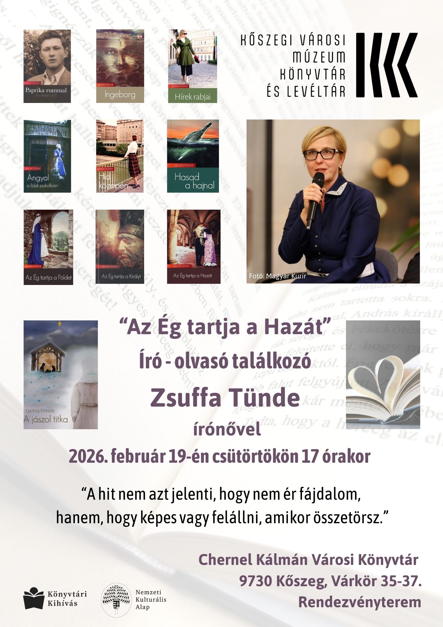 Minden érdeklődőt sok szeretettel várunk 2026. február 19-én csütörtökön 17 órára a különleges életutat, műveket felidéző estre rendezvénytermünkbe! Az írónővel Czagány Tünde, könyvtárunk munkatársa beszélget.