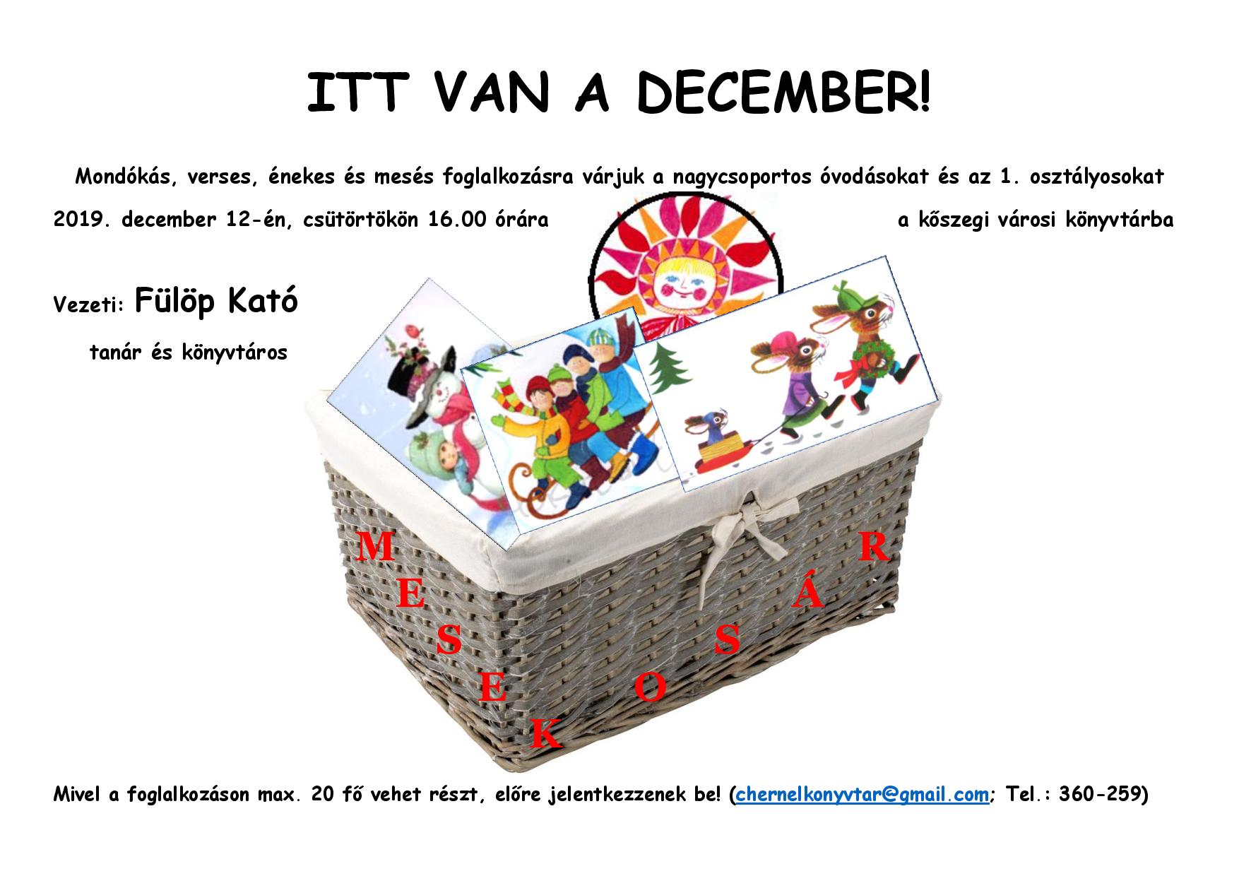 Mondókás, verses, énekes és mesés foglalkozásra várjuk a nagycsoportos óvodásokat és az 1. osztályosokat 2019. december 12-én, csütörtökön 16.00 órára. Mivel a foglalkozáson max. 20 fő vehet részt, előre jelentkezzenek be! (chernelkonyvtar@gmail.com ; Tel.: 360-259)
