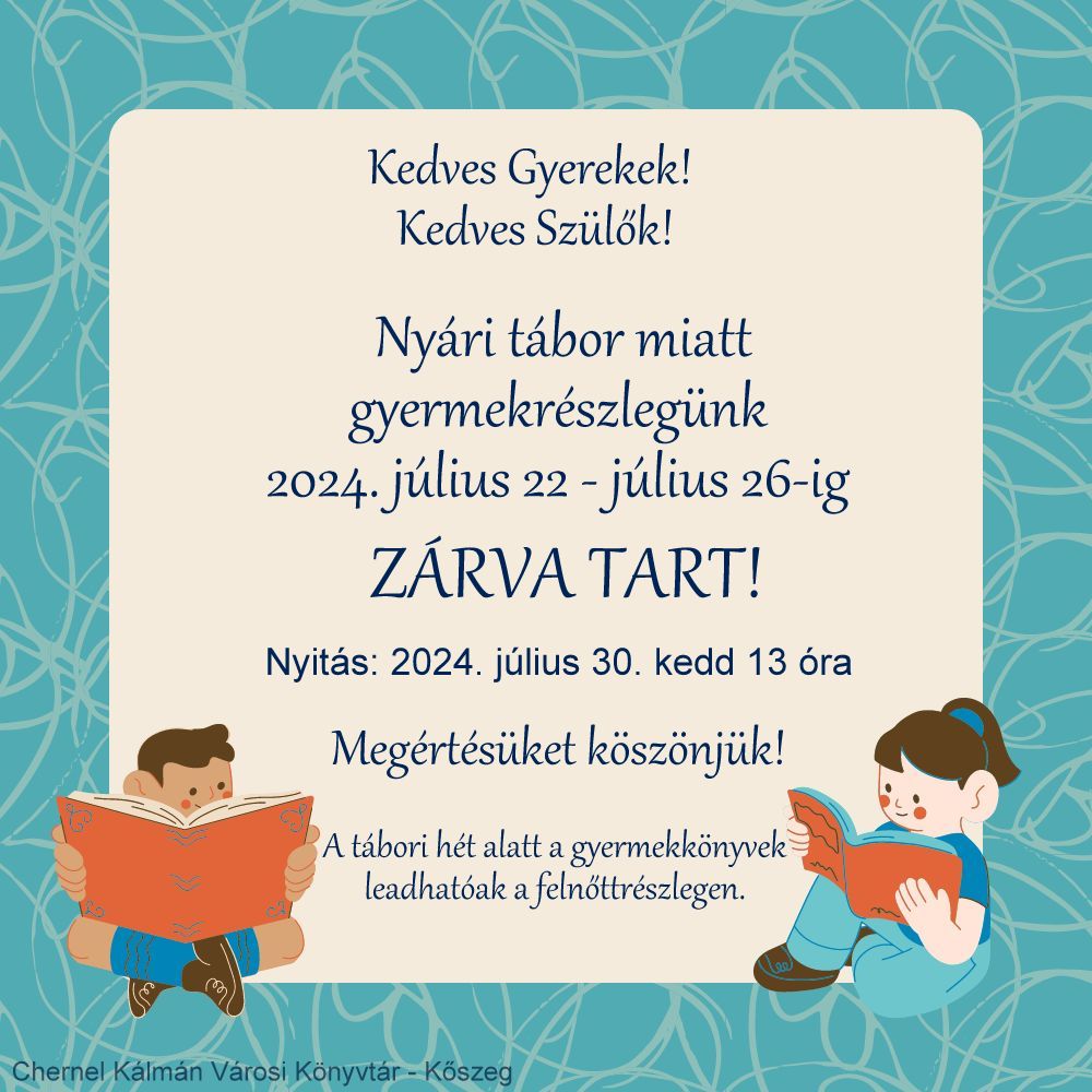 2024. július 22-26-ig gyermekkönyvtárunk nyári tábor miatt zárva tart! A gyermekkönyvek a felnőttrészlegen leadhatóak!