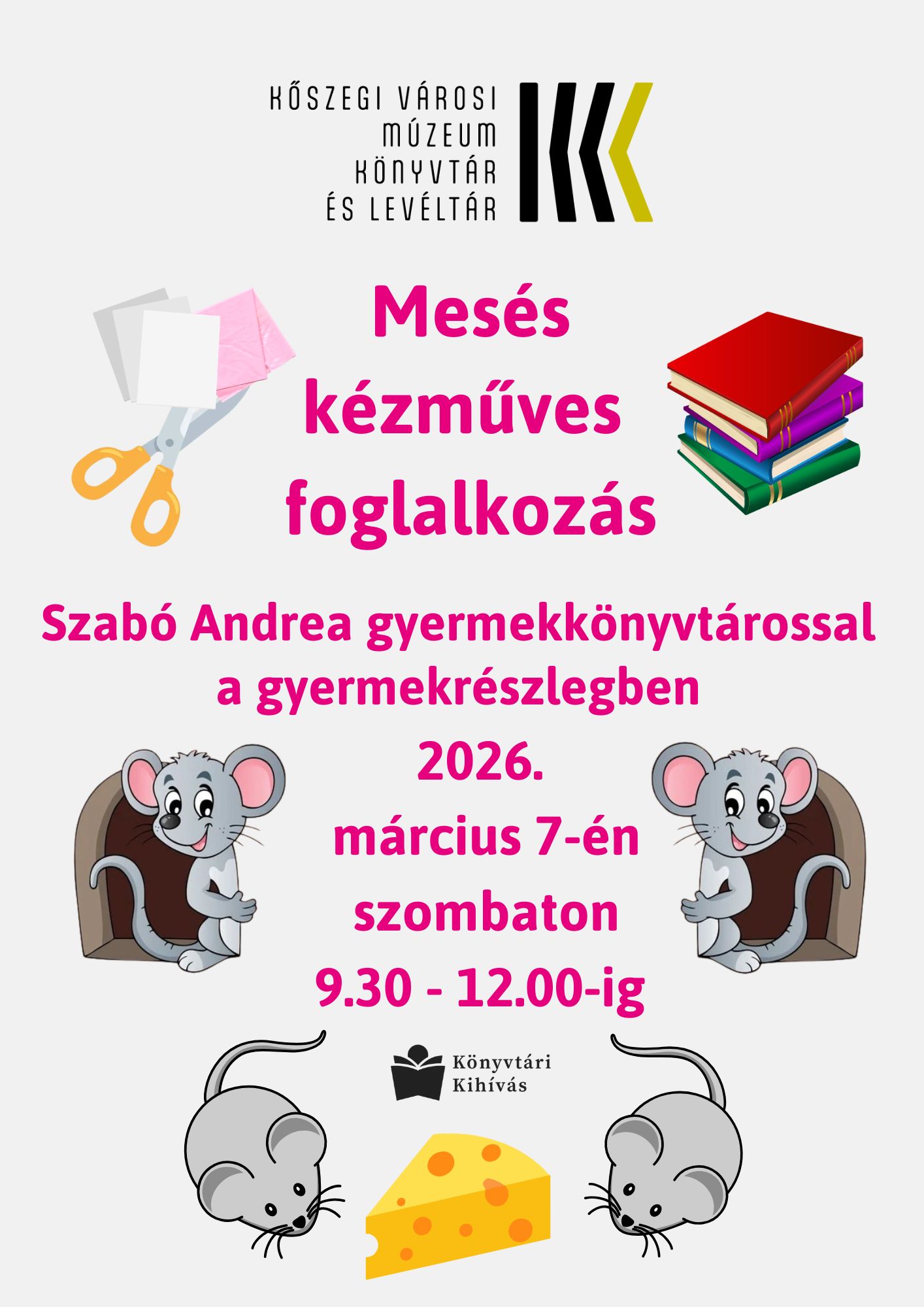 Az elmaradt február 21-ei mesés kézműves foglalkozás 2026. március 7-én szombaton lesz megtartva 9.30 - 12.00 óráig a gyermekrészlegben Szabó Andrea gyermekkönyvtárossal.