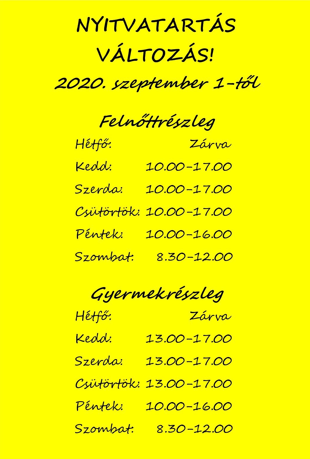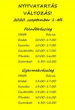 Tájékoztatjuk olvasóinkat, hogy könyvtárunk nyitvatartása 2020. szeptember 1-től az alábbiak szerint módosul.