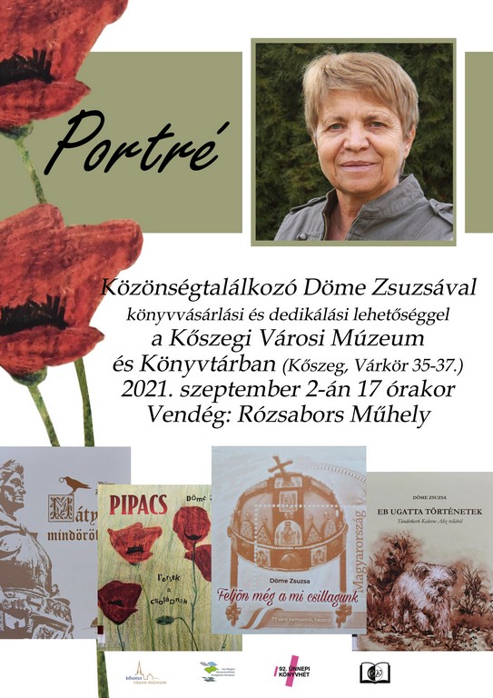 Szeretettel várjuk a Kőszegi Városi Múzeum és Könyvtárba az érdeklődőket 2021. szeptember 2-án 17 órára Döme Zsuzsa írónő közönségtalálkozójára, mely során könyvvásárlási és dedikálási lehetőség is lesz! A programot a Rózsabors Műhely színesíti majd az írónő megzenésített verseinek előadásával.