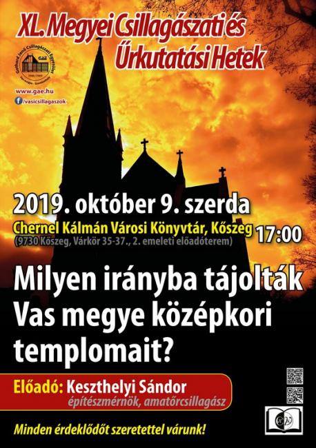 Milyen irányba tájolták Vas megye középkori templomait? címmel lesz előadás 2019. október 9-én, szerdán 17 órakor.